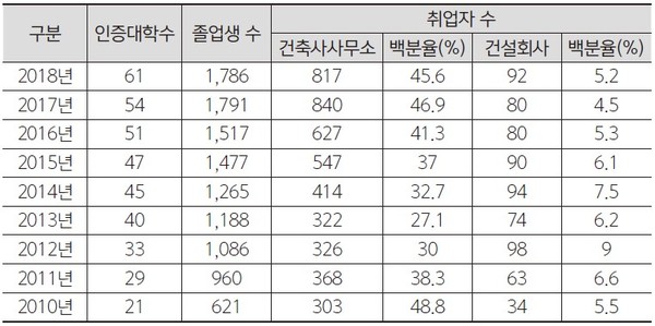 국내 건축사사무소 인력난이 여전한 가운데 건축학 계열 졸업자들의 실무수련 신청률이 50%조차 안 되고 있어 우려의 목소리가 높다. 취업률도 마찬가지다. 건축학 인증 프로그램 졸업생들의 건