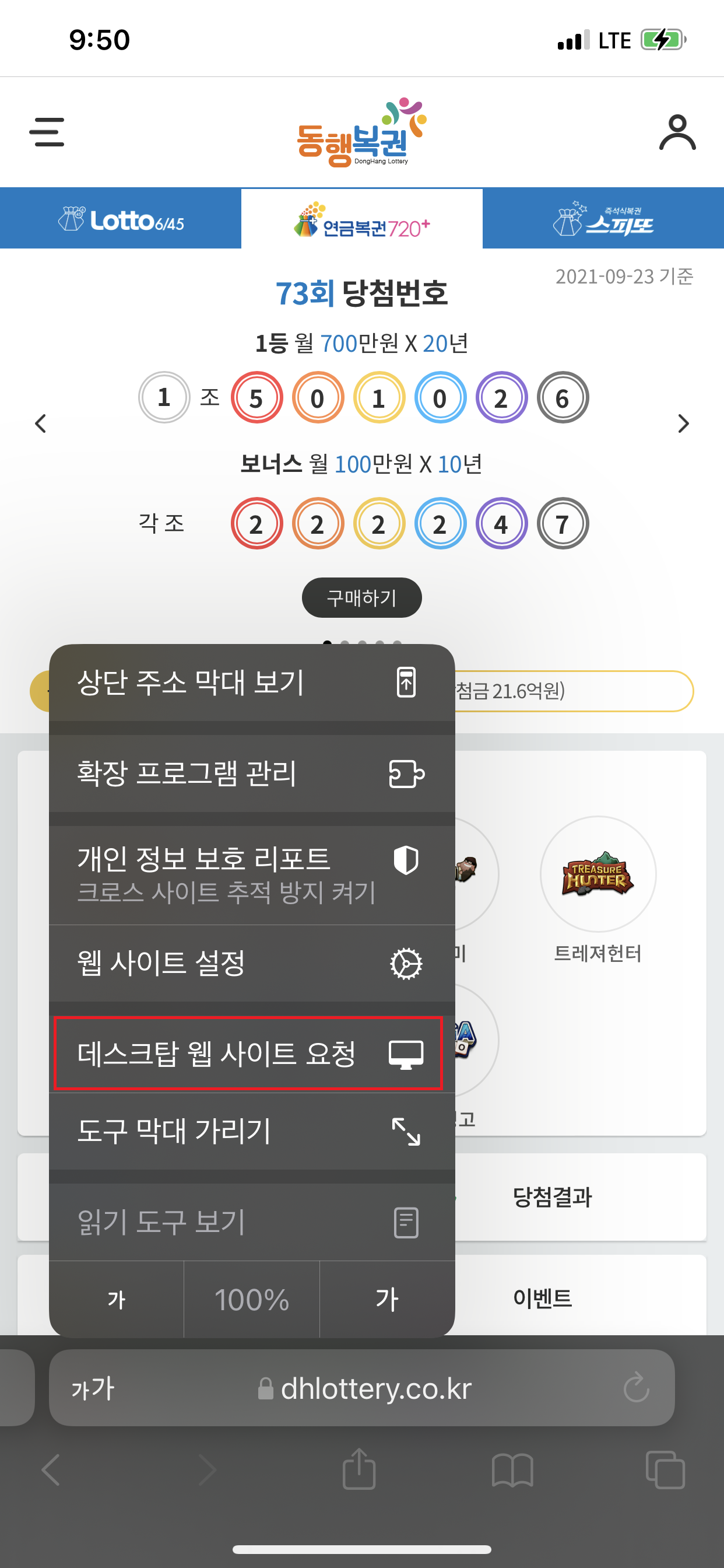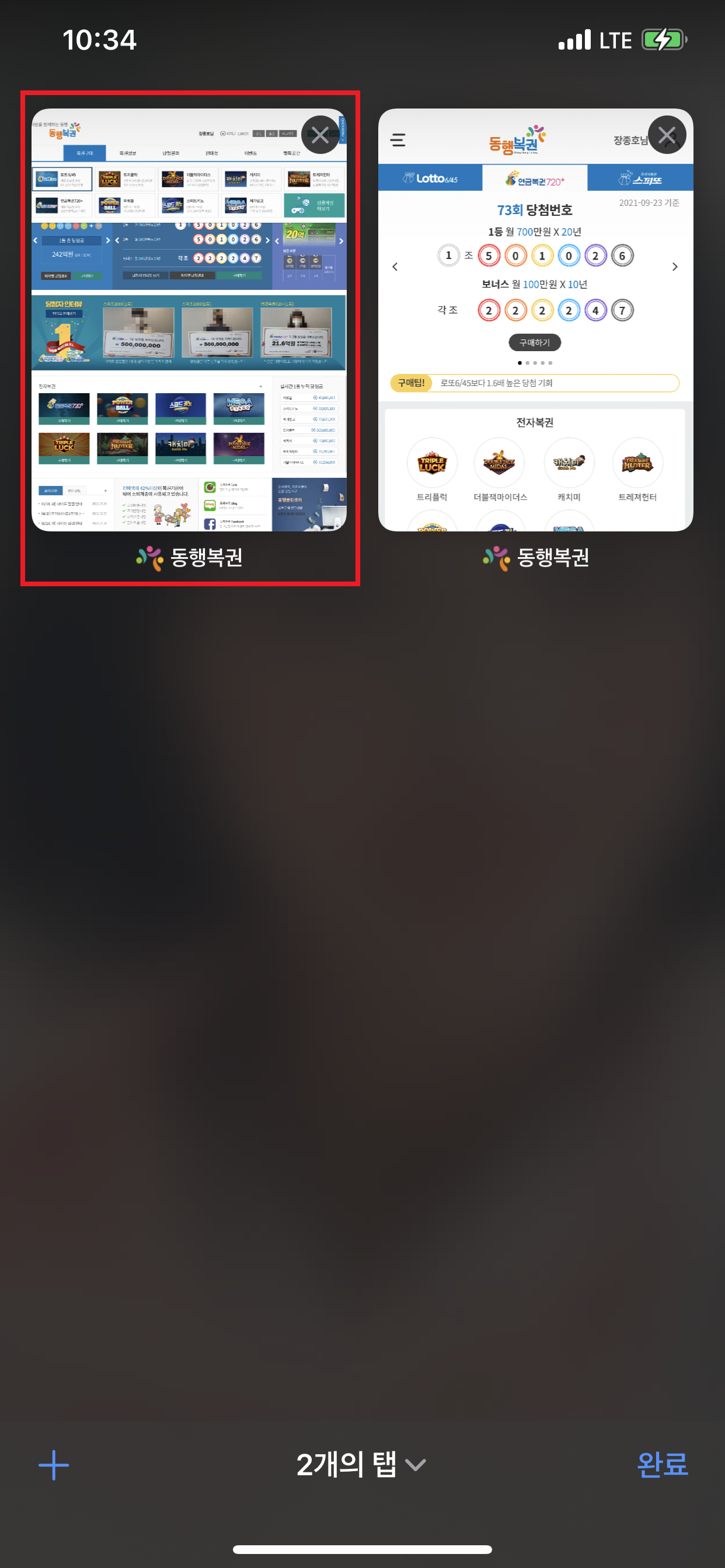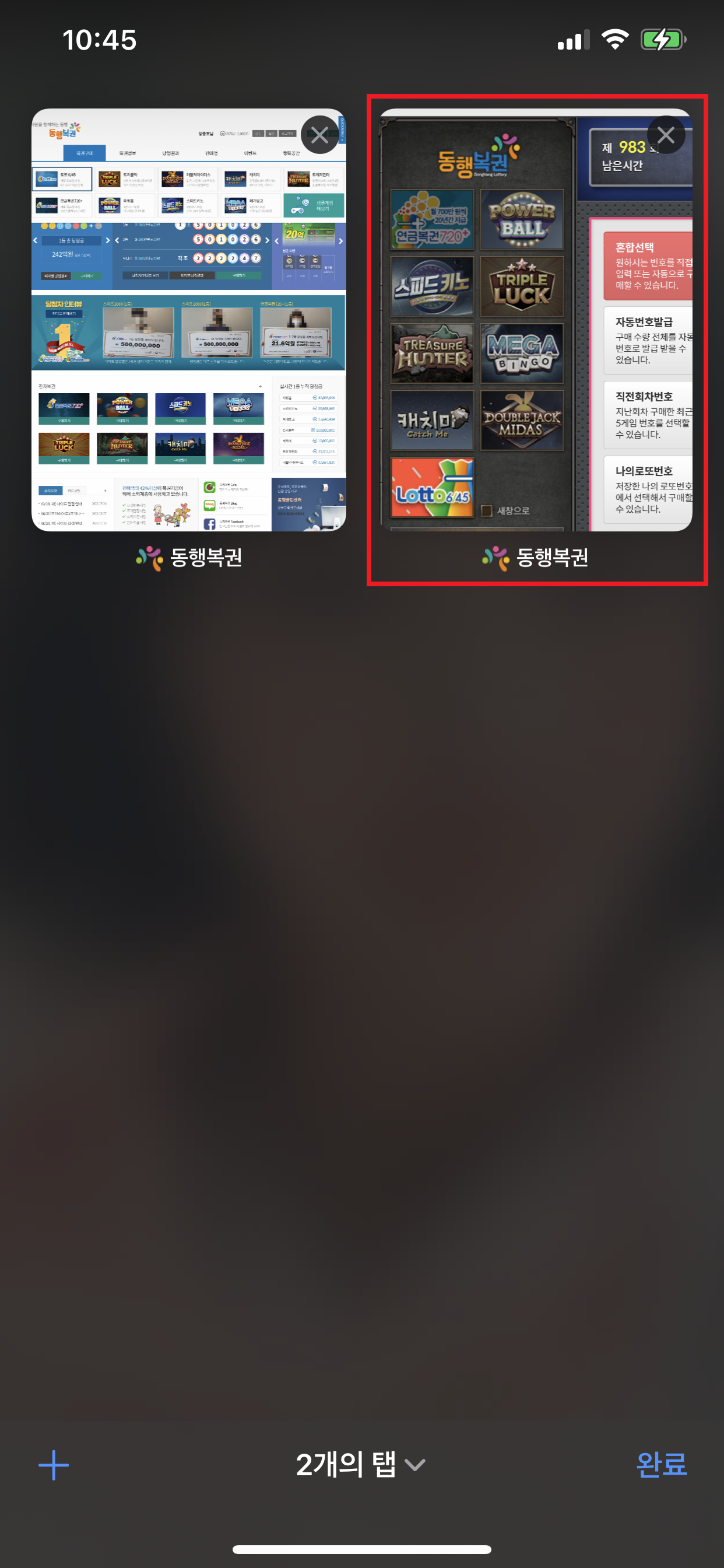 - 브라우저의 탭을 선택하여 확인해보면 복권 구매 사이트가 "데스크탑 웹 사이트"로 변경된 것을 확인할 수 있습니다.