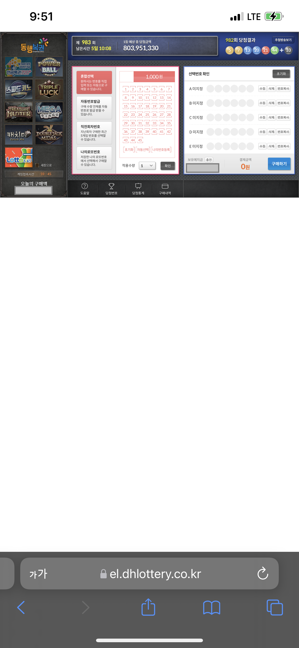 7) 복권 구매 > 로또 6/45 를 탭해서, 새창이 뜨지 않습니다.
