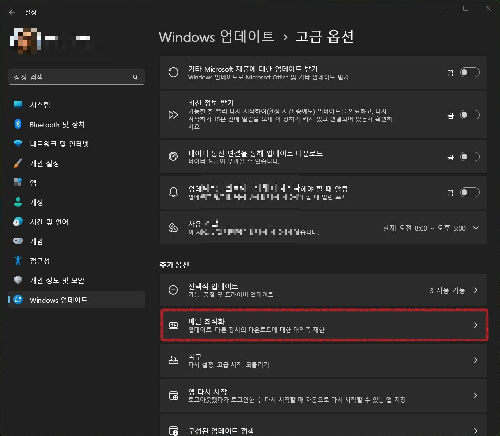 허~ 그런데, Windows 10 과 달리 Windows 11 에서는 "배달 최적화"가 어디 갔는지 안 보이네요. ^^